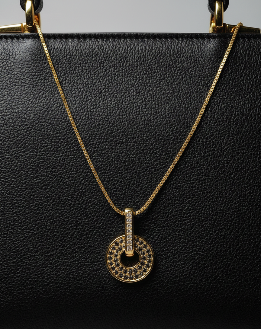 This sleek, circular pendant features brilliant micro crystals set in a textured gold-toned halo, offering an effortless way to wear "Quiet Luxury" every day. Its minimalist design and dazzling sparkle make it the perfect versatile piece for sophisticated layering or standalone shine.