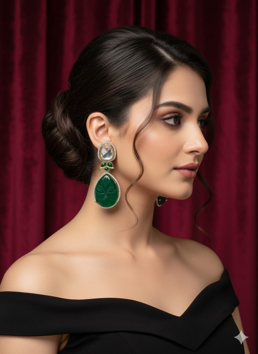 These Premium drops feature dazzling Moissanite accents surrounding a deeply carved, oversized green teardrop, giving you the grand look of carved emeralds. The brilliant, diamond-like sparkle and high-shine gold-plated setting guarantee a luxurious, heirloom-worthy finish for your most glamorous looks.