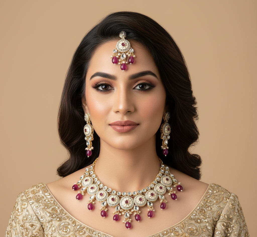 A luxe Kundan set dripping in deep amethyst hues and soft pink. It's giving ancient lineage, but make it main character energy.